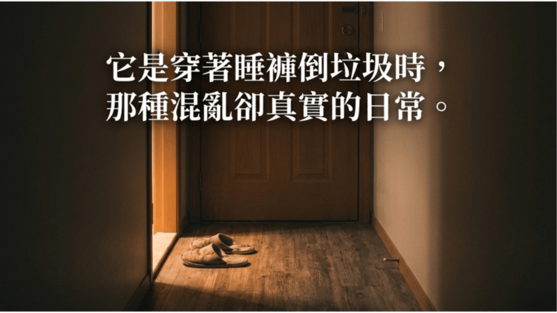 結果長大之後才發現:幸福最常出現的場景,其實是「邊穿著睡褲倒垃圾,邊從垃圾袋裡救出被丟錯的帳單」這種畫面。很凌亂、很日常,卻又莫名真實。