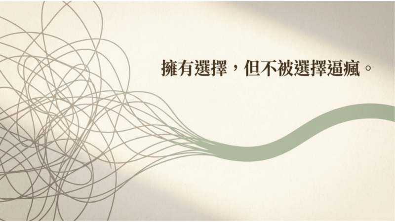 現代人很辛苦的是,選擇太多,心卻越來越亂。心理學家 Barry Schwartz 在《The Paradox of Choice》選擇的悖論裡提到,太多選擇反而容易讓人焦慮、後悔,甚至覺得不幸福。