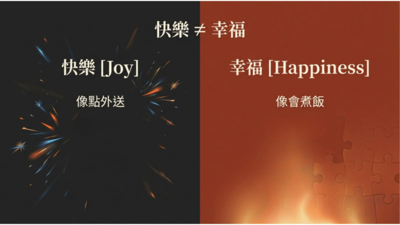 我用生活版的比喻來說,快樂像點外送,幸福像會煮飯。真正幸福有哪些要素呢?