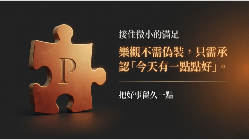 每天睡前挑一件「今天還不錯」的事,講給自己聽,像在幫大腦存檔。不是寫成作業,是像在跟朋友說「今天雲很好看的故事」、「今天我有忍住沒亂回訊息」、「今天我有把自己從情緒裡抱出來」。這種小小的停留,會讓正向情緒從煙花變炭火。